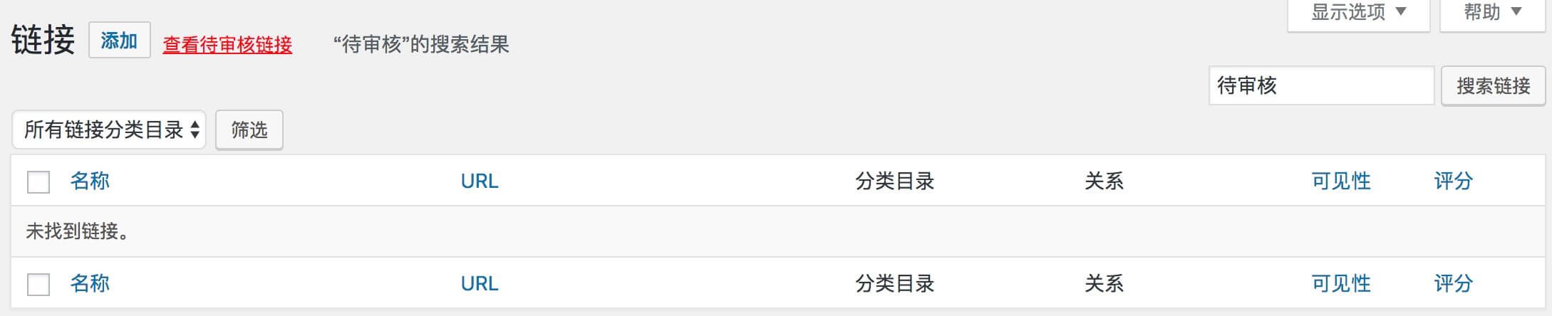 <a href="/wp-admin/link-manager.php?s=待审核&action=-1&cat_id=0&action2=-1" style="color:red;margin-left:5px;">查看待审核链接</a>然后保存后,查看后台-链接管理页,点击按钮 效果如下图: