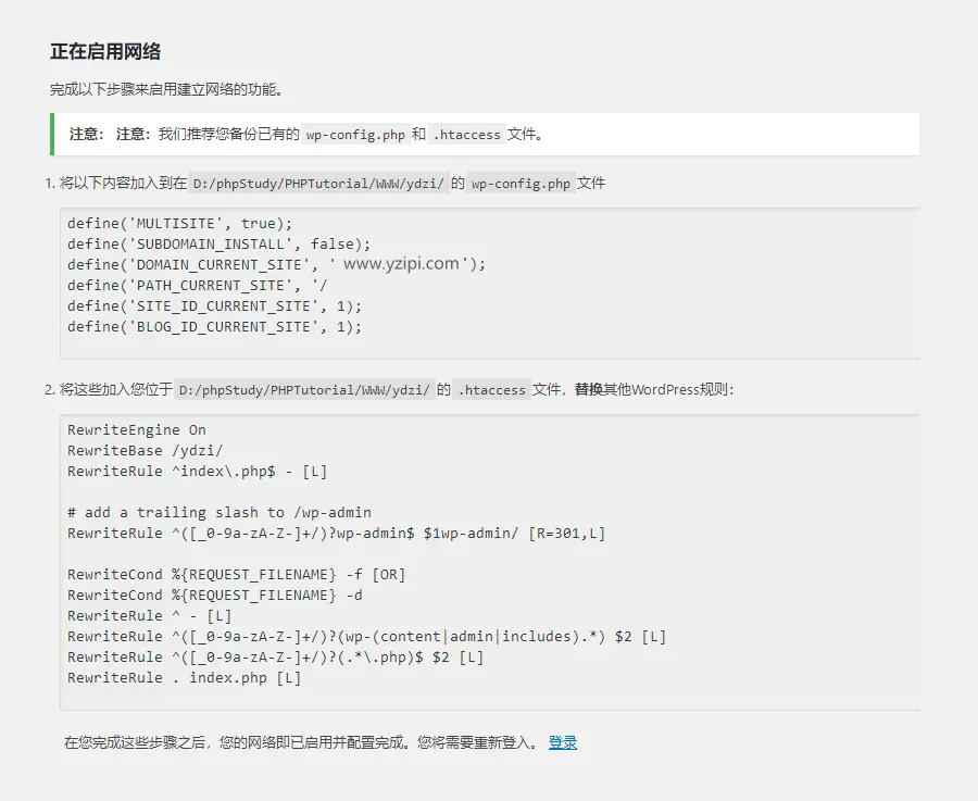 有些同学,完成配置后,打不开子站的仪表盘和网站,这伪静态出问题。上面第二步 ,后台贴出 .htaccess 文件伪静态规则是 Apache 环境下的,而 Nginx 的静态规则就需改成下面这样。
