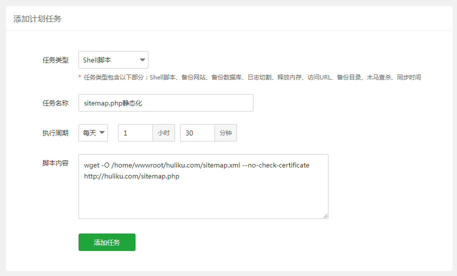 wget -O /www/wwwroot/huliku.com/sitemap.xml http://huliku.com/sitemap.php如果站点是 https 则添加以下代码: