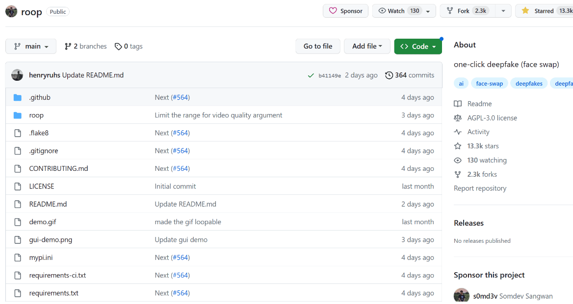 首先说说这个开源项目roop,如下项目在GitHub上获得13k星