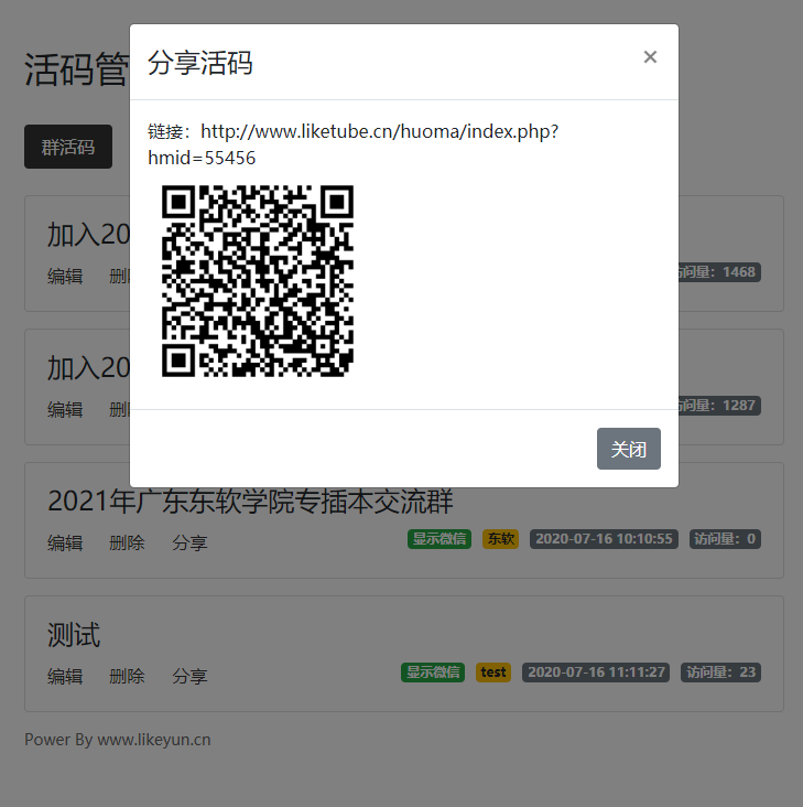 微信群二维码活码工具,生成微信群活码,随时可以切换二维码!微信官方群二维码有效期是7天,过期后无法扫码进群,或者是群人数满200人就无法扫码进群,如果我们在推广的时候,群满人或者过期了,别人还想进群,我们将会失去很多推广效果,所以有了群活码,可以在不更换链接和二维码的前提下,切换扫码后显示的内容,灵活变换!