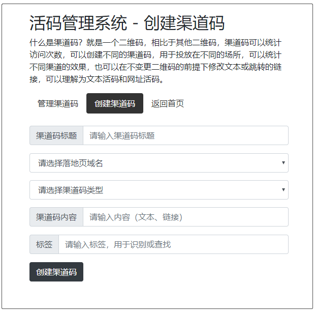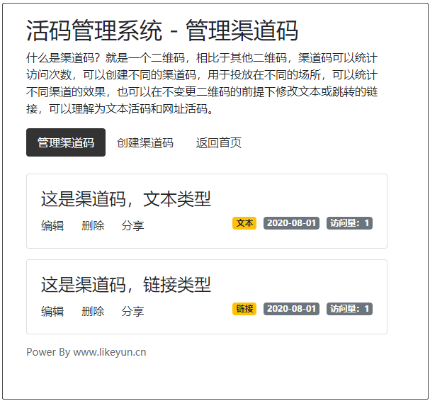 什么是渠道码?就是一个二维码,相比于其他二维码,渠道码可以统计访问次数,可以创建不同的渠道码,用于投放在不同的场所,可以统计不同渠道的效果,也可以在不变更二维码的前提下修改文本或跳转的链接,可以理解为文本活码和网址活码。