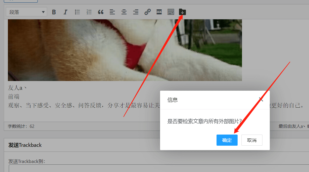 启用之后会给新增两个功能:编辑器增加在前端本地化外部图片的插件和文章保存时在后端自动本地化外部图片的功能(区别在于一个是发布前本地化和发布后本地化)。