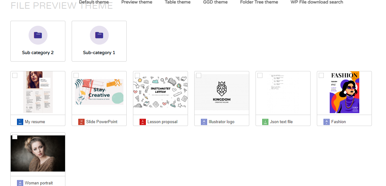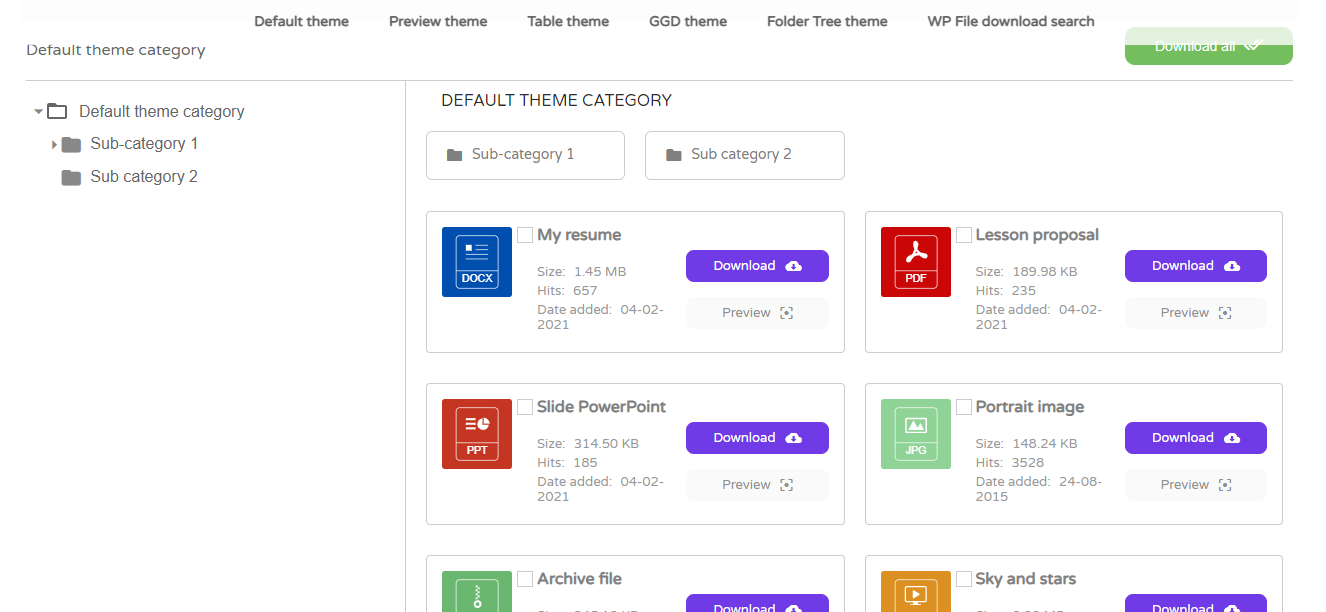 插件中包含五个主题,但不仅仅是主题!它们改变了您向用户提供文件的方式。包括的主题是标准文件列表、Google Drive like、Table、Accordion 文件树、带封面的文件预览。该系统也非常灵活,因为您可以为每个文件类别应用一个主题,甚至可以创建您自己的文件下载主题。
