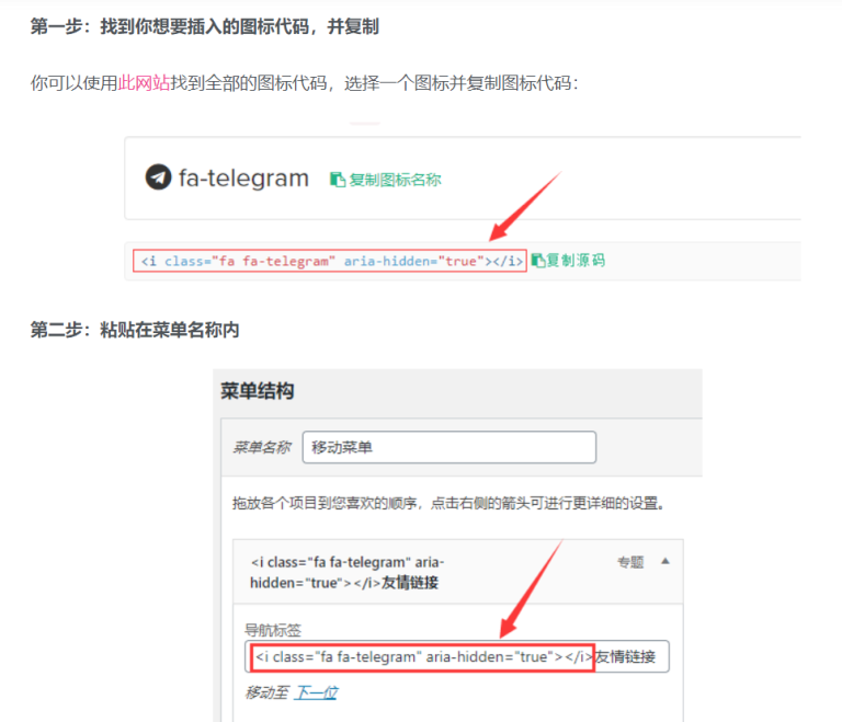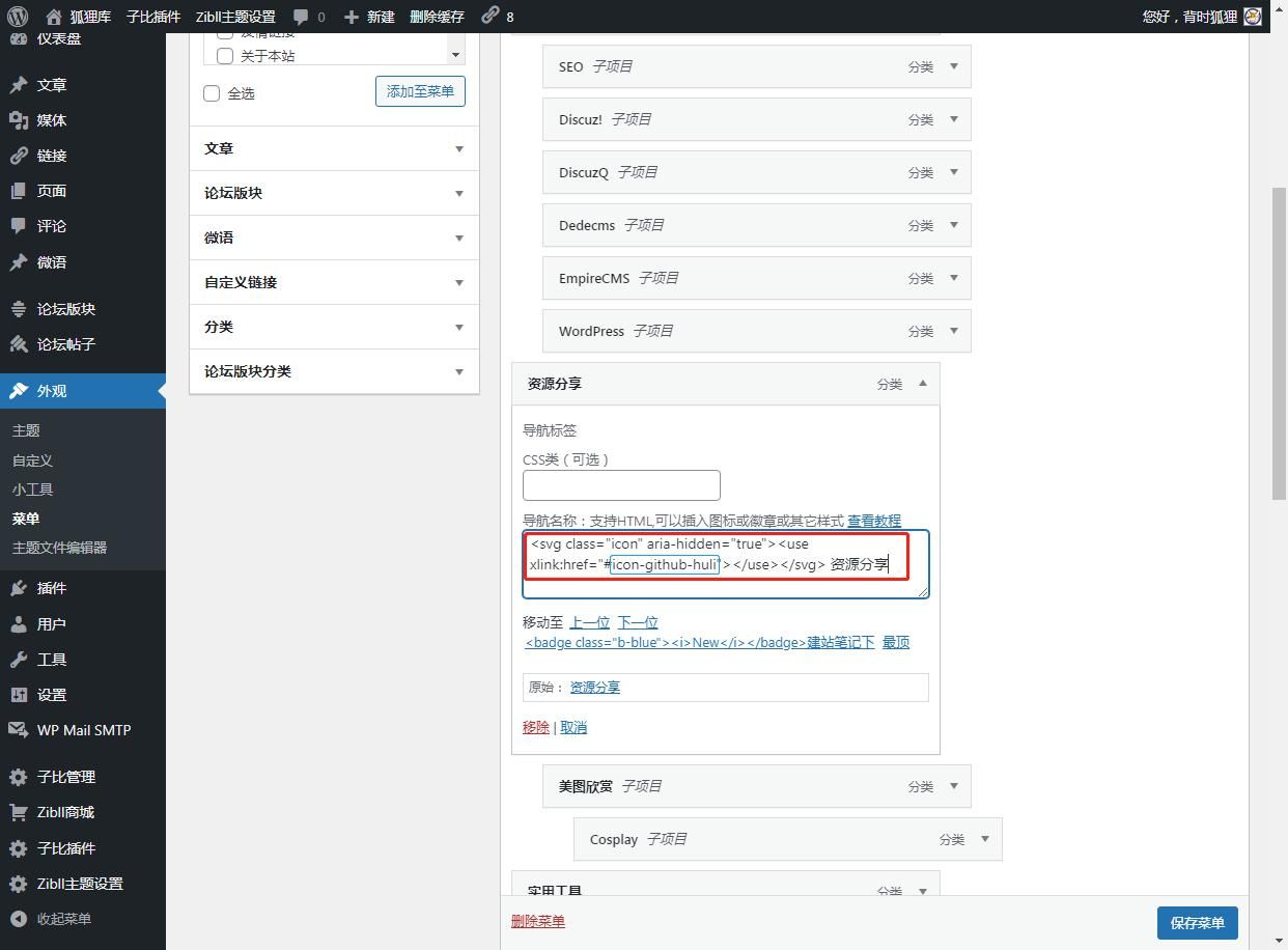 2、在 WordPress 后台>>外观 >>菜单>>文字前 添加上面代码,保存即可。