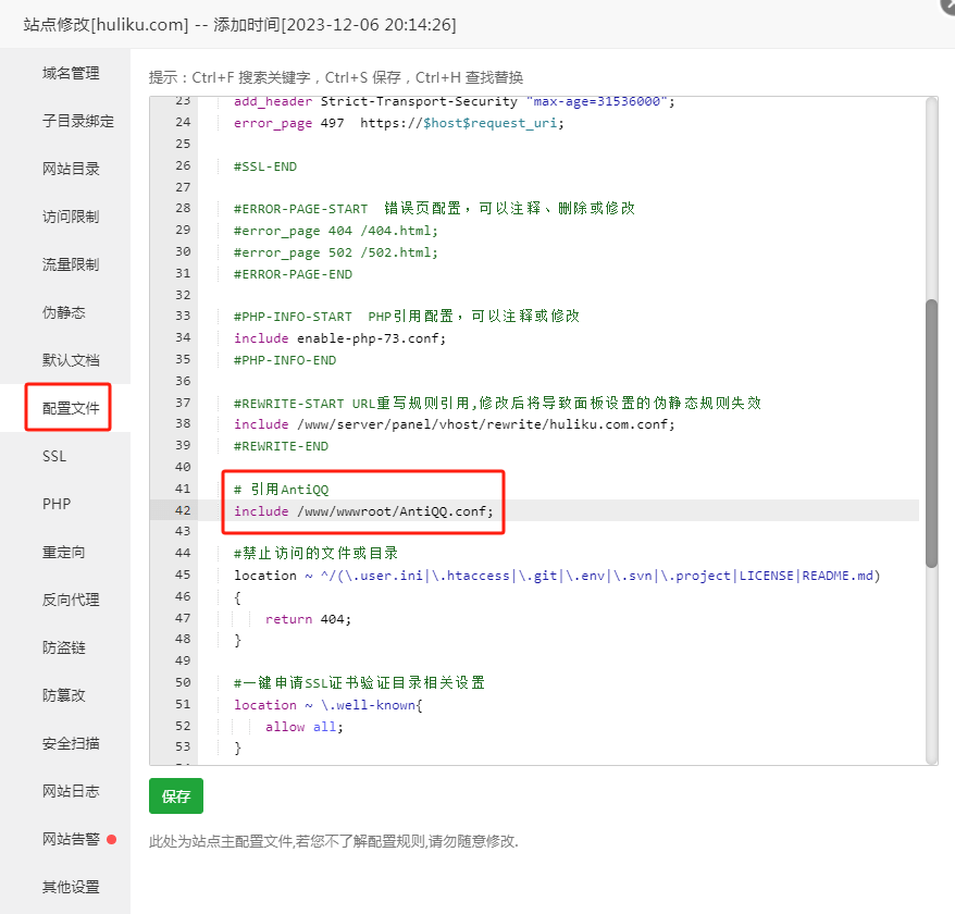 include /www/wwwroot/AntiQQ.conf;重启Nginx或Nginx配置即可启动