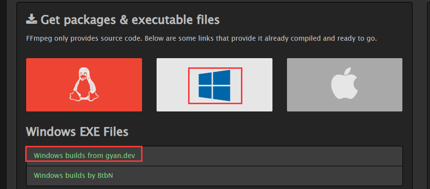 首先打开ffmpeg官网:https://ffmpeg.org/download.html,下载对应系统的文件,这里以Windows为例