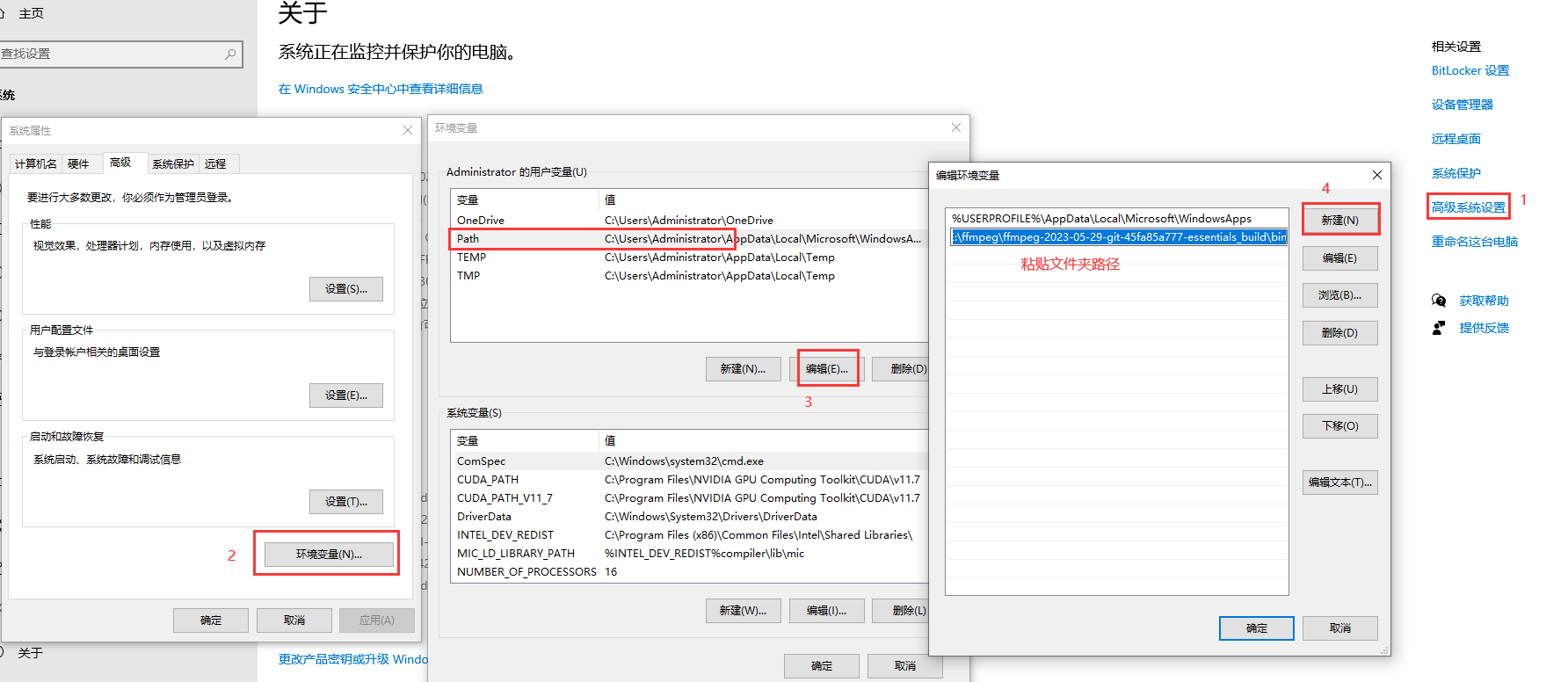 然后鼠标右键点击我的电脑-属性-高级系统设置-环境变量-选中Path点击编辑-新建,然后在输入框内输入上面的文件夹路径,然后确定。