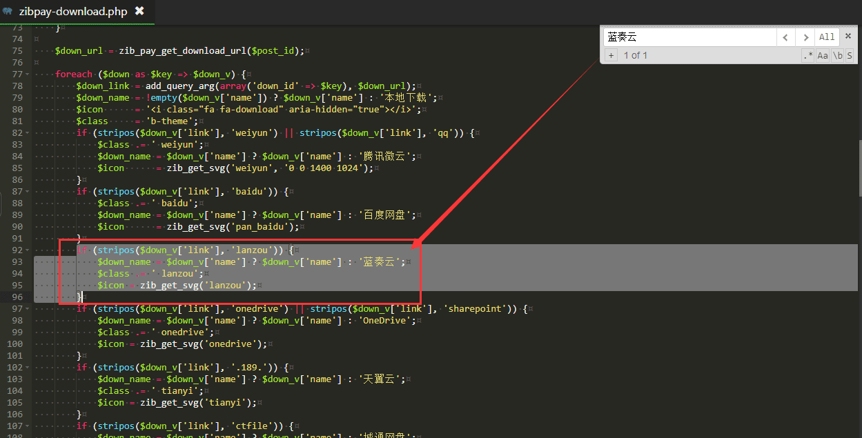 2.打开文件,ctrl+f搜索“蓝奏云”你会看到这段代码,作为参考
