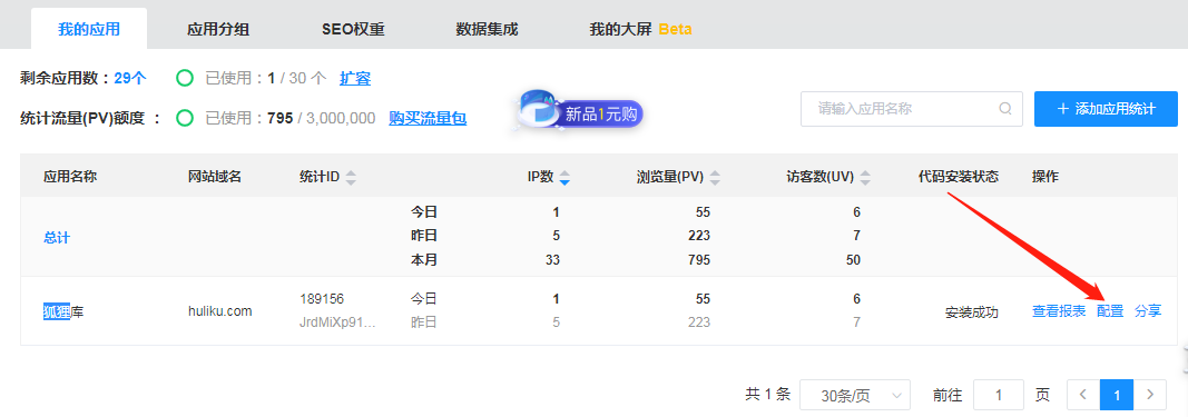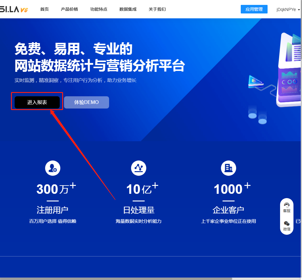点击进入下方网址,进入以后注册账号点击添加应用,输入我们的网站信息,输入之后我们无需添加代码,点击进入报表。