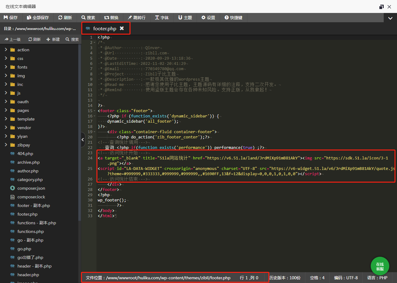 代码放到你们需要显示的地方就行了。狐狸是放到 /wp-content/themes/zibll/footer.php