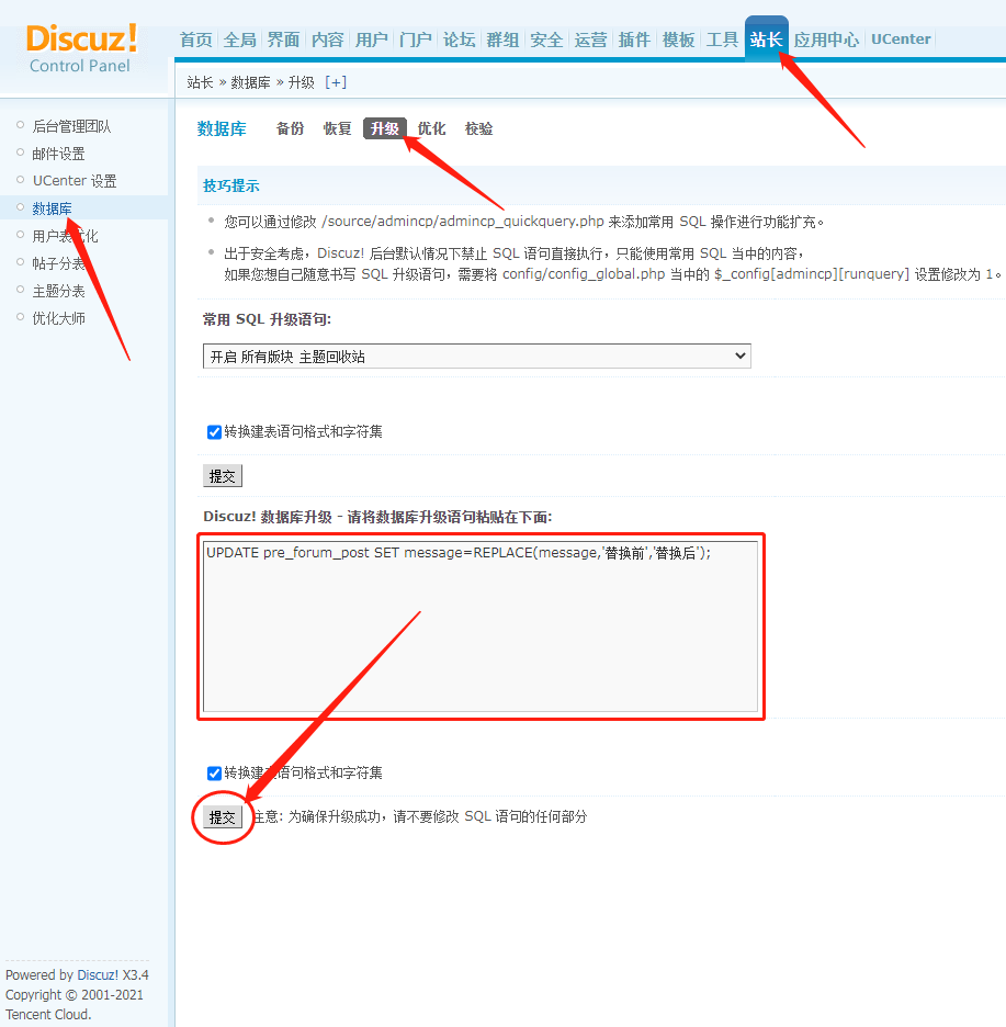 UPDATE pre_forum_thread SET subject=REPLACE(subject,'dqgcw.com','rdzjw.com');输入以上你需要的代码后,点击提交即可!