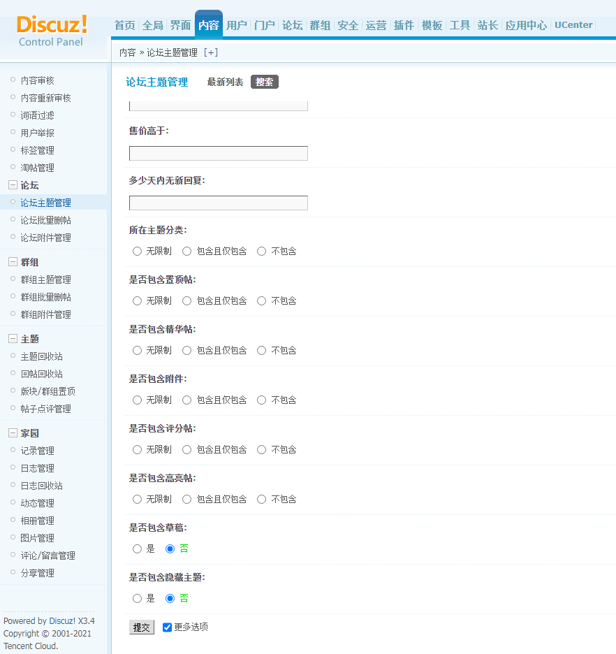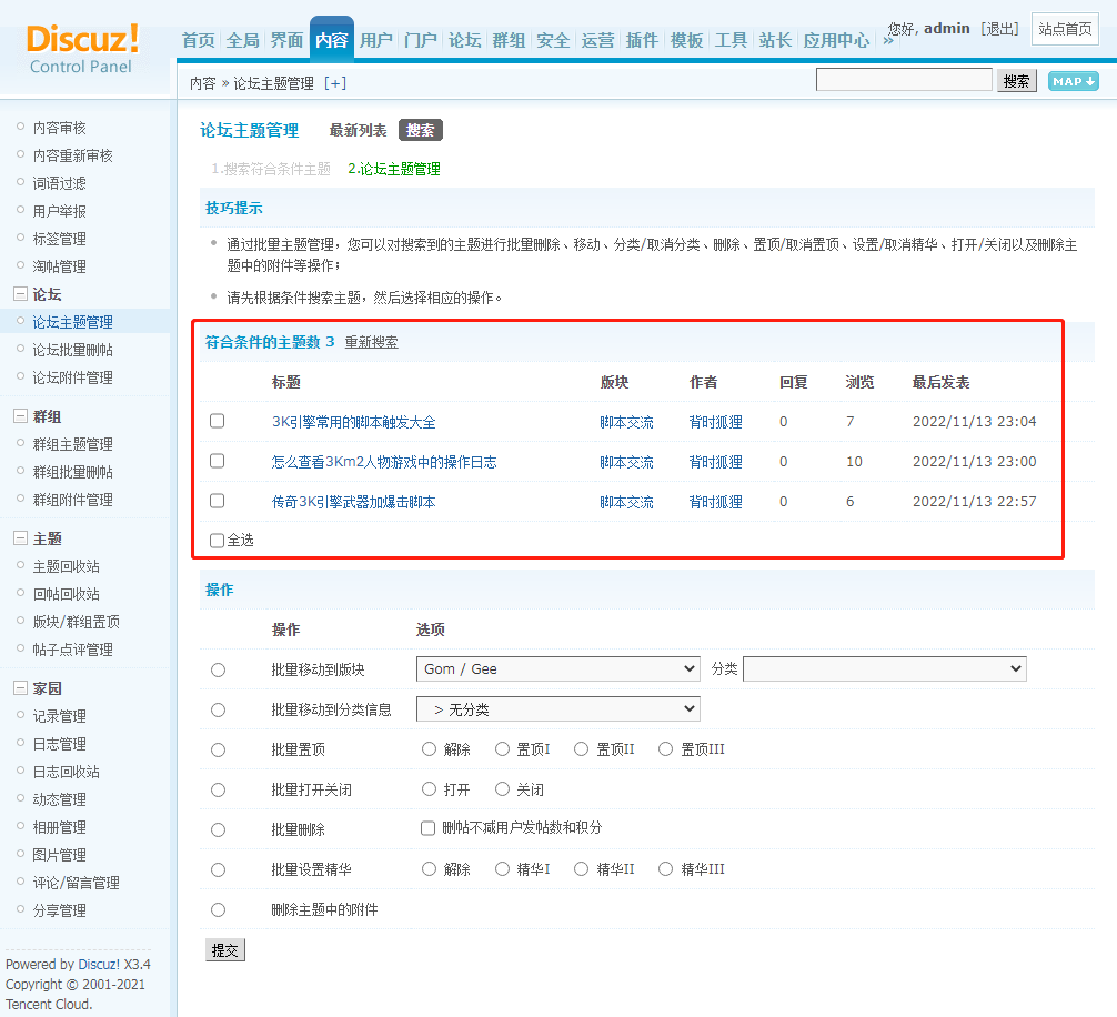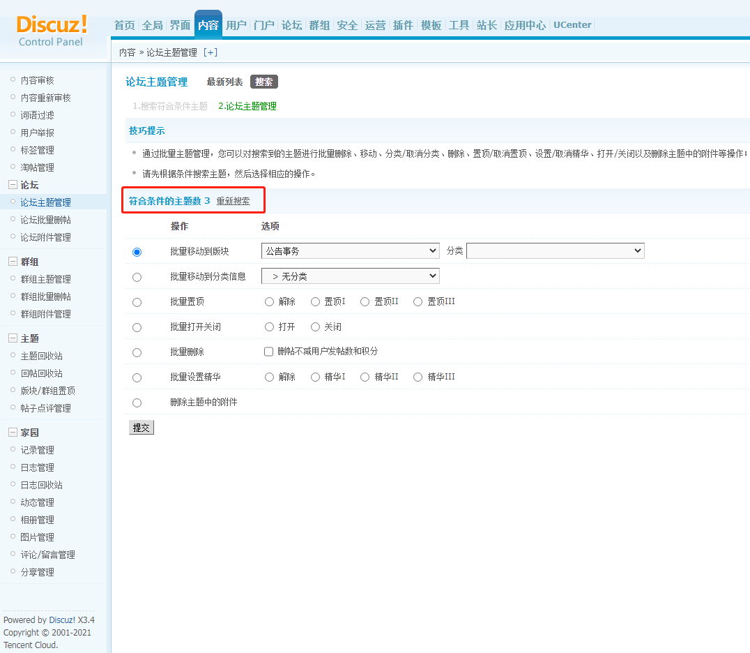 该功能主要用于对论坛主题的管理工作,搜索出符合一定条件的主题,然后进行批量的操作。包括:批量移动到版块、批量移动到分类、批量置顶、批量打开关闭、批量删除、批量设置精华、删除主题中的附件。下面主要介绍一下这个功能的使用方法。