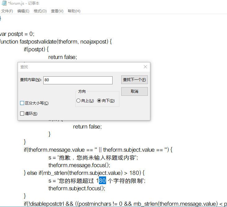 三,修改js文件,找到sitatic/js/forum.js文件,把里面的80改为你要的数字。