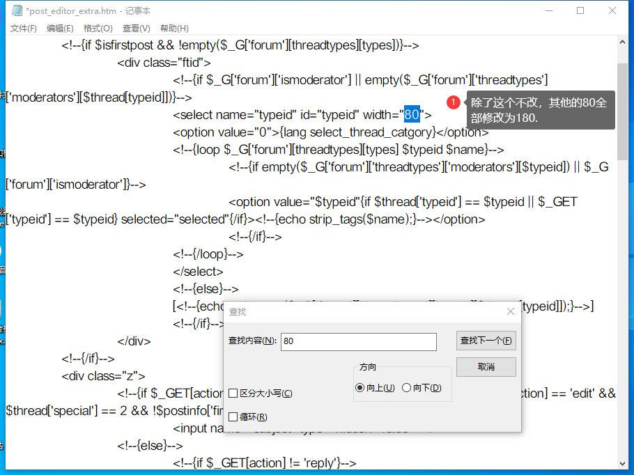 查找字符 80 将这个文件里(除了第一个和最后一个代码的 80 字符)所有的 80 替换为 200 。