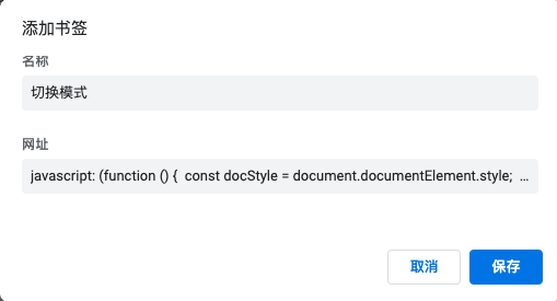 然后打开浏览器书签管理器,添加新书签,在网址栏粘贴这段代码并保存:
