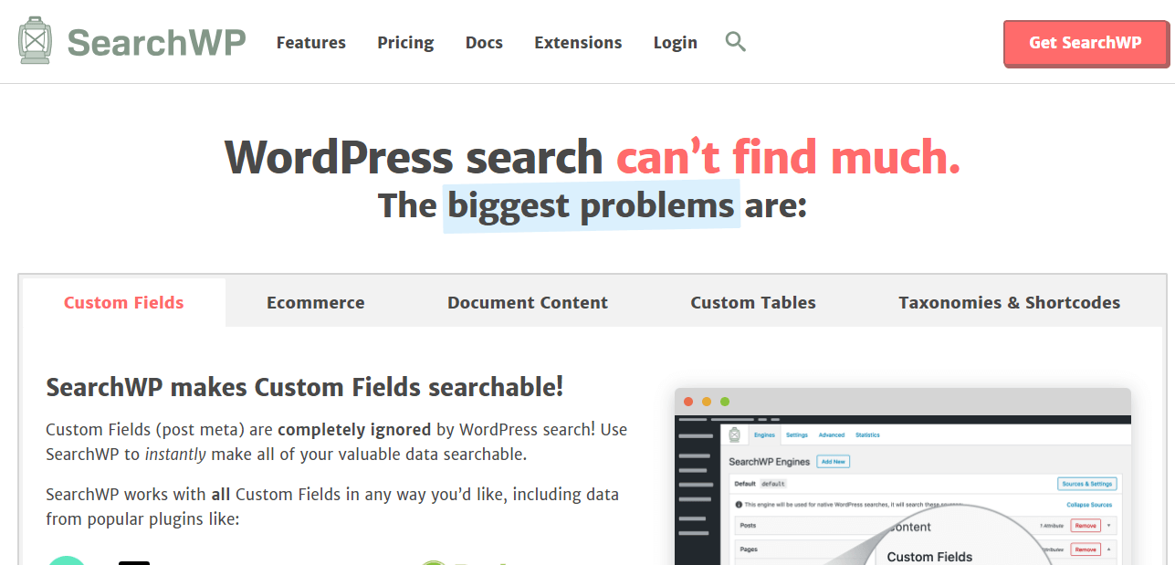 WordPress 搜索完全忽略自定义字段(后元) !使用 SearchWP 可立即搜索所有有价值的数据。