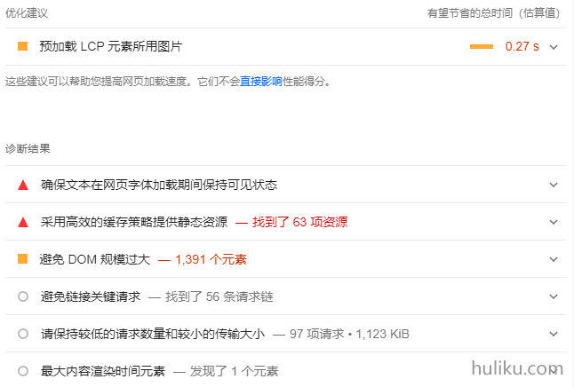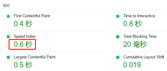 重点关注Core Web Vitals和下图数据,它们决定了首屏内容显示速度以及显示质量,非常重要,尽量让下图6个指标都变绿。