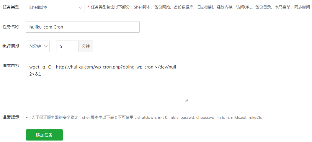 wget -q -O - https://xxx.com/wp-cron.php?doing_wp_cron >/dev/null 2>&1一些主机可能有限制并迫使您使用更长的时间间隔(30 分钟及以上)。没关系,尽量用最低的。即使是你自己的服务器, 5或10分钟这个频率也足够了。