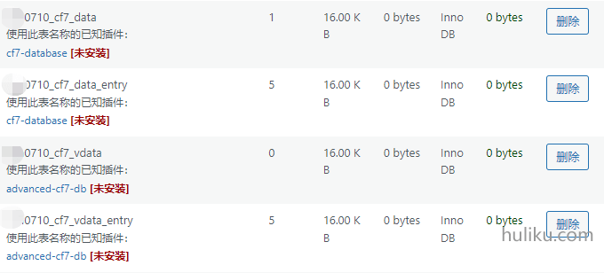 页面往下拉,会看到被卸载插件残留的表,点击“删除”。例如下图是之前安装的Contact Form7残留的表。