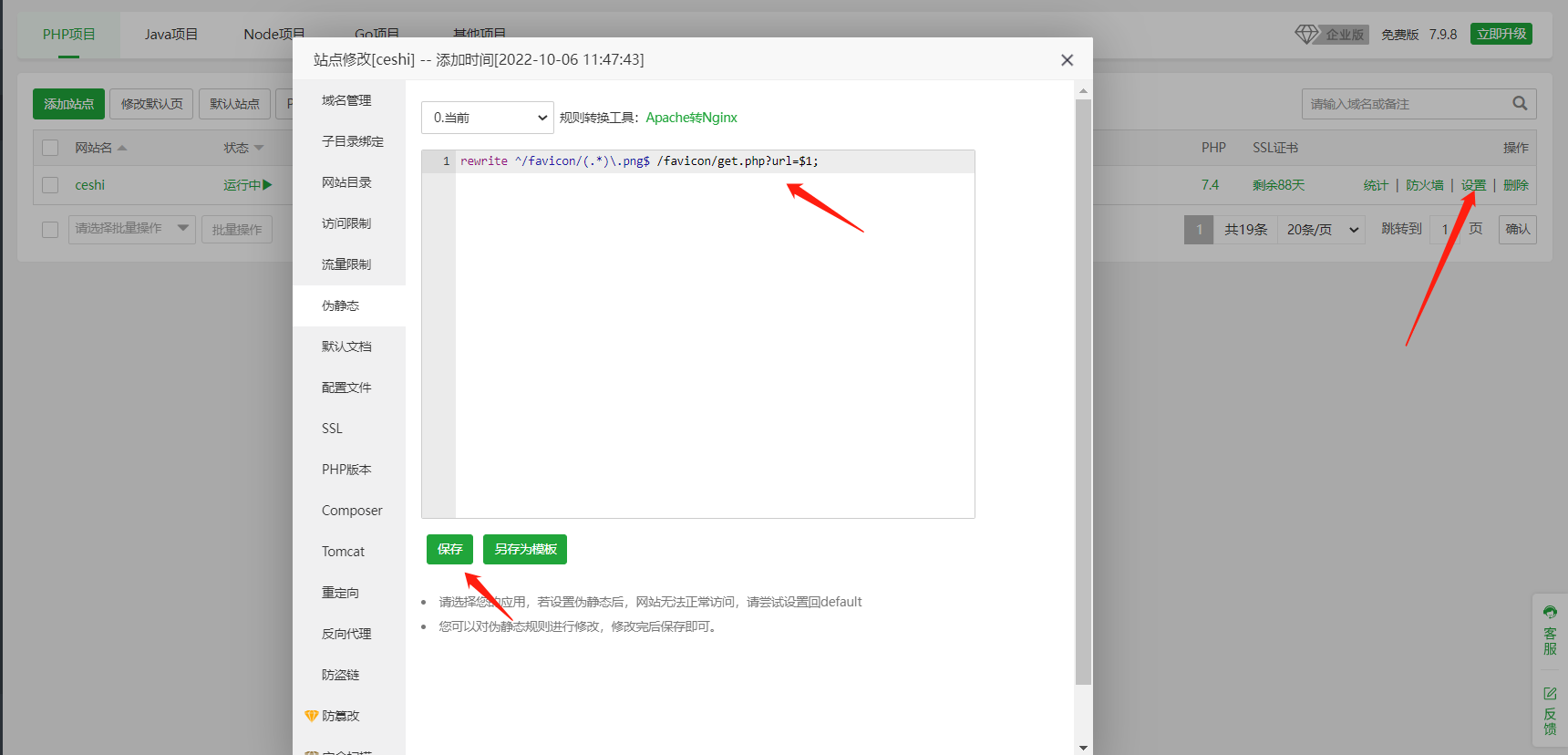 </IfModule>Nginx放在宝塔的伪静态位置,Apache的用户自行研究,我这里就展示一下Nginx