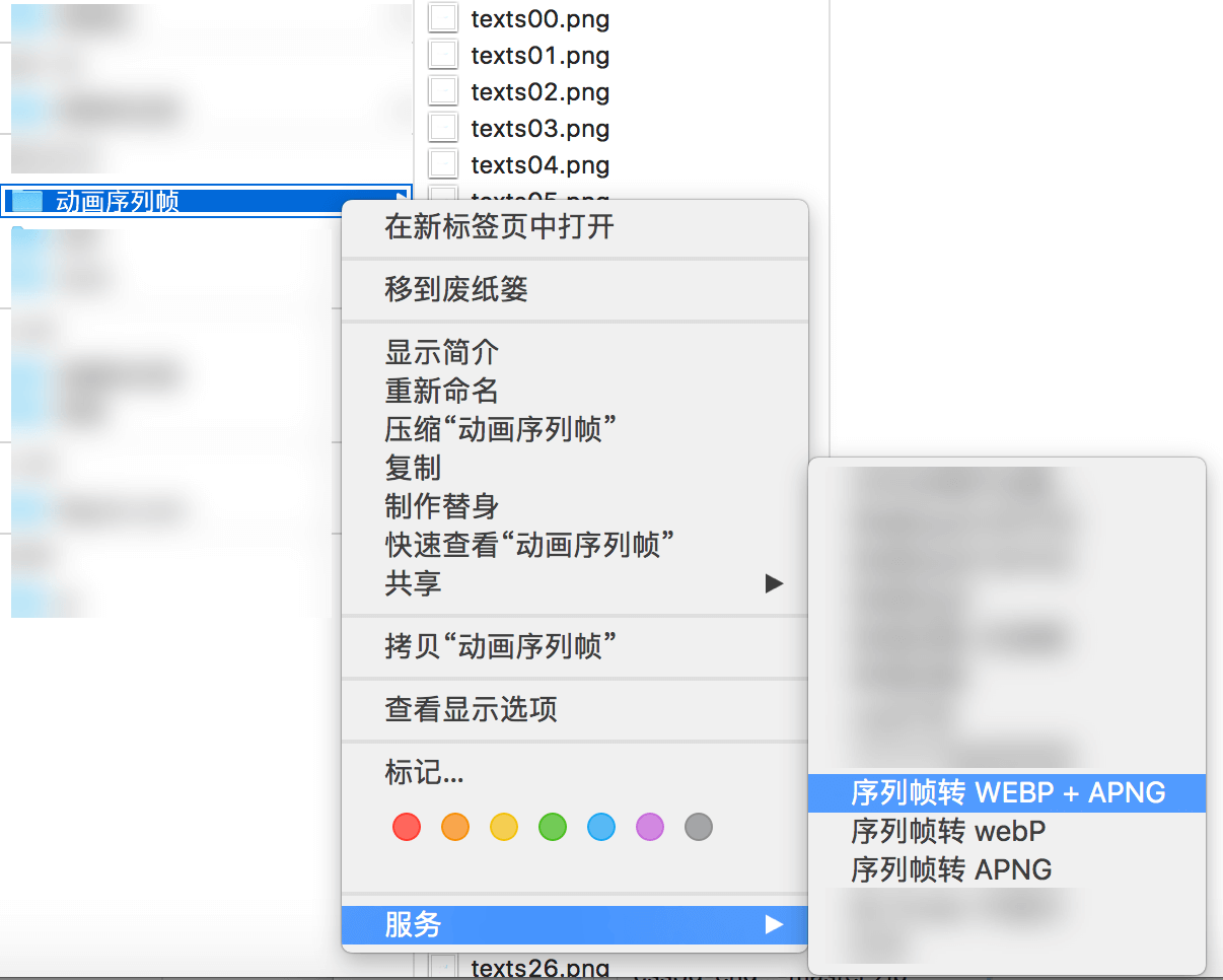 右键->服务->序列帧转 webp + apng,根据提示操作即可。也可以单独导出 webp 或者 apng 格式。 - 可以选择多个序列帧文件夹进行操作,导出的webp或apng动画放置在序列帧文件夹所在的目录。