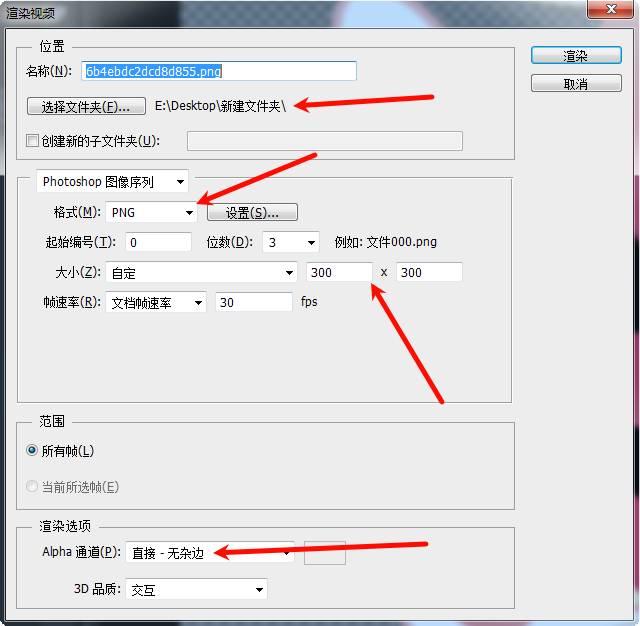 然后选择输出文件夹,图像序列模块中格式选择PNG,图像大小根据自行需求选择,如需透明背景请选择“直接-无杂边”,确定好需求后点击渲染。狐狸这里还是老版本的Photoshop