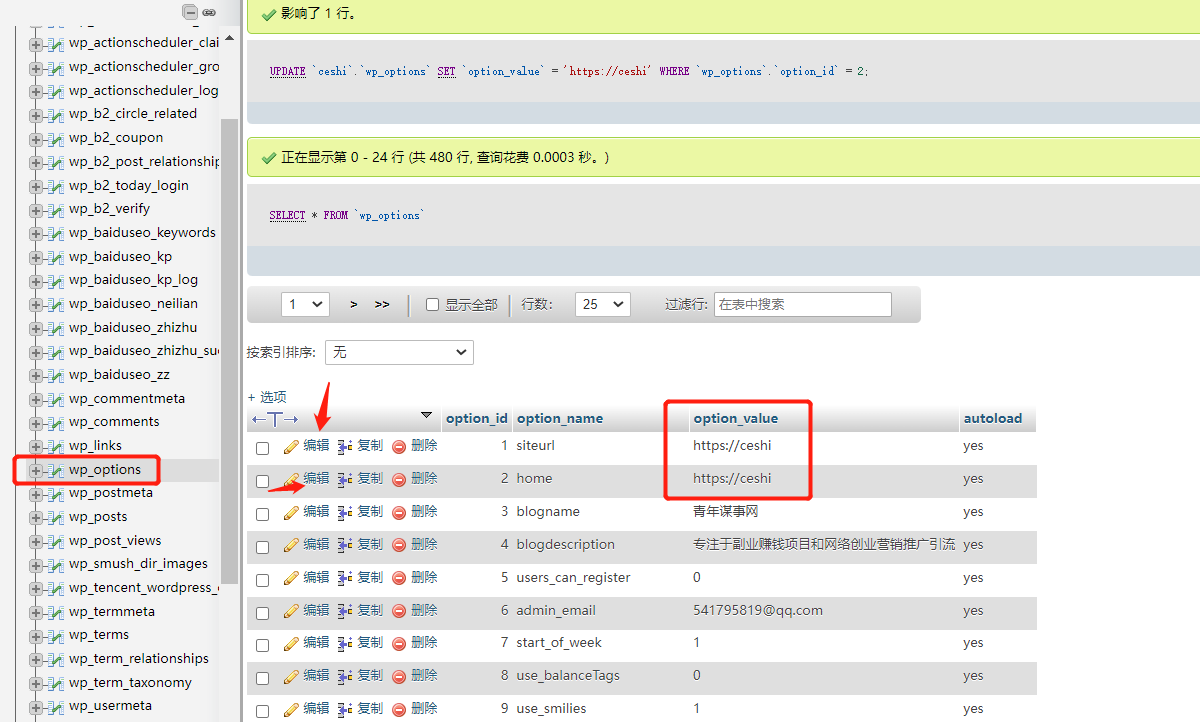 2.找到 wp_options 表格,将 option_value 字段里的旧的域名换成你现新的域名,是两处位置需要修改。