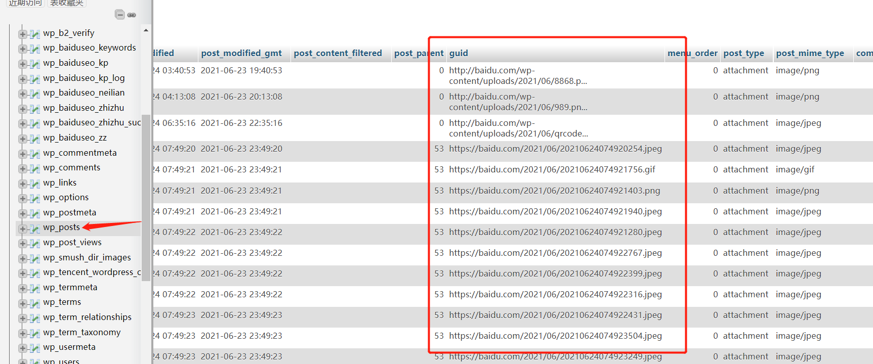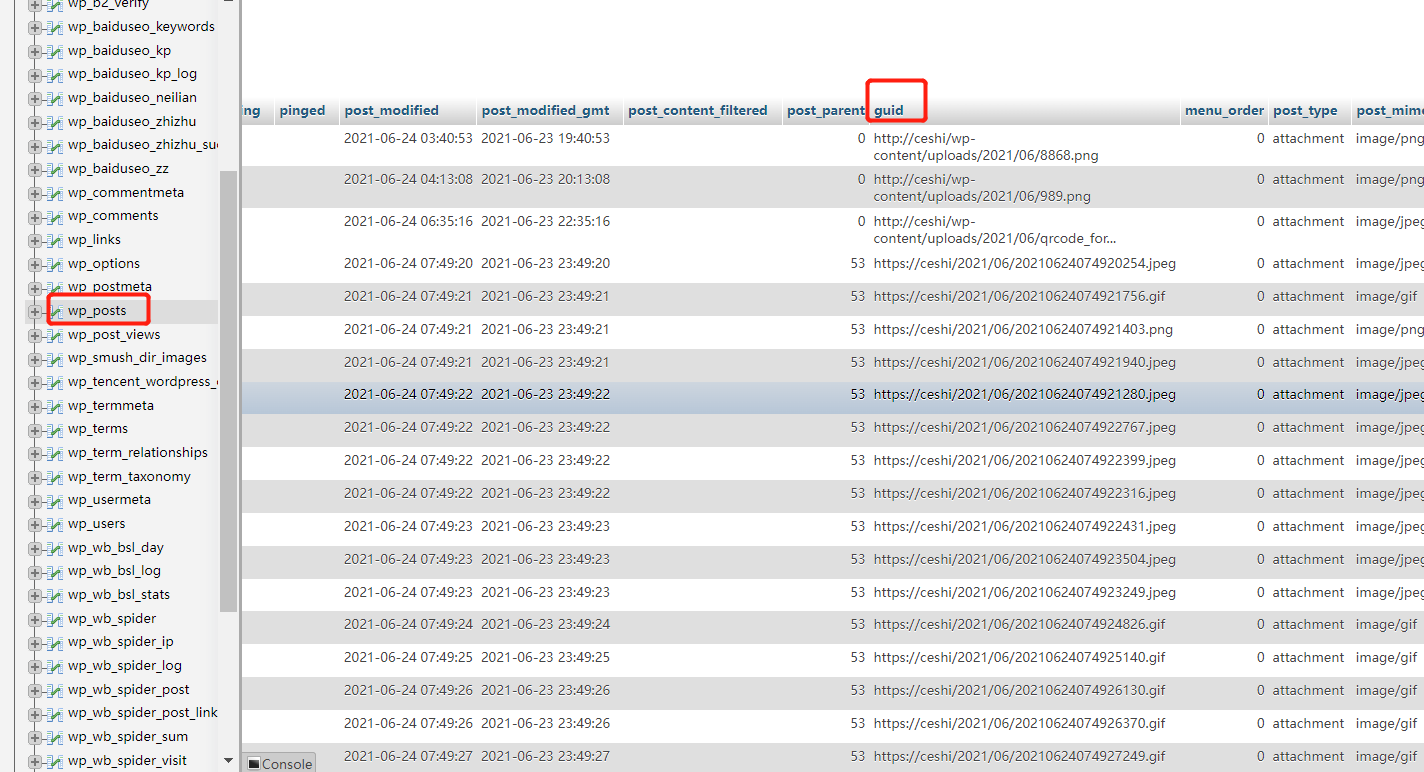 5、在进入wp_posts表,找到guid查看是否修改成功即可。