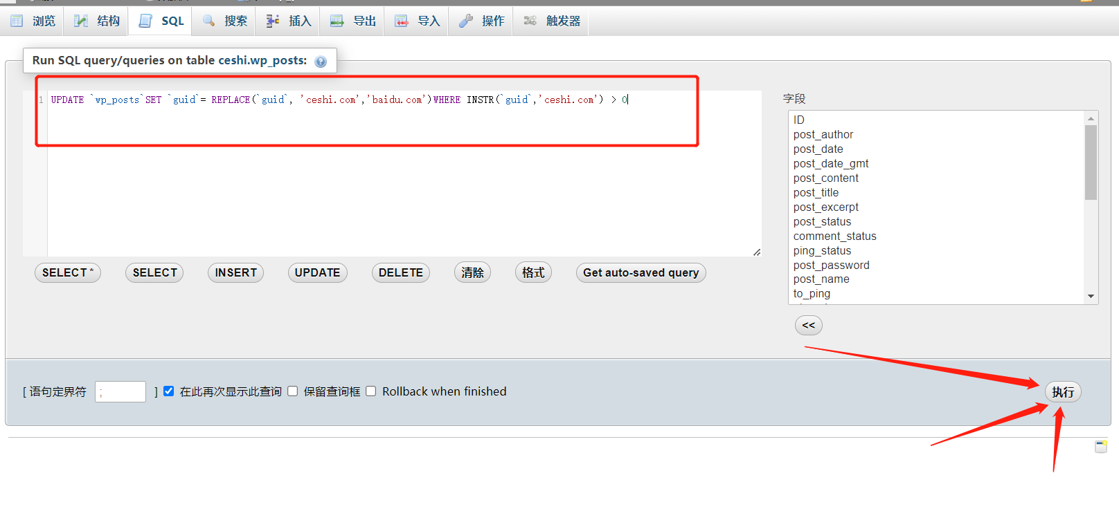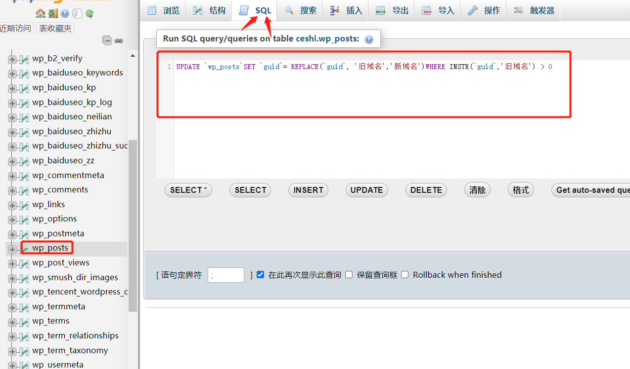 UPDATE `wp_posts`SET `guid`= REPLACE(`guid`, '旧域名','新域名')WHERE INSTR(`guid`,'旧域名') > 02、把语句复制在 wp_posts 表,点击上方的SQL,然后在文本框粘贴语句