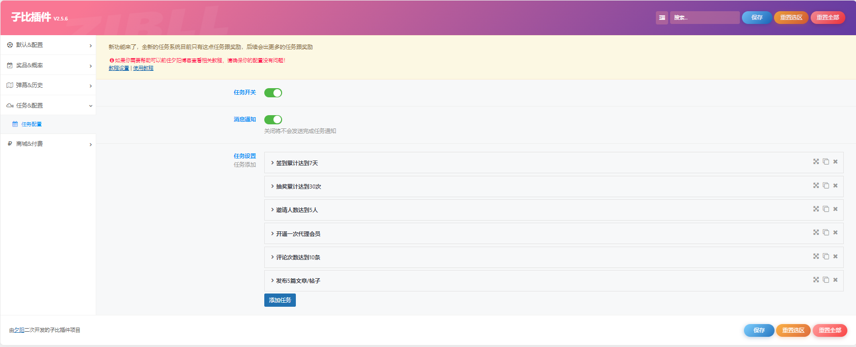 全新抽奖配置、任务系统、积分兑换余额、购买抽奖次数等等。