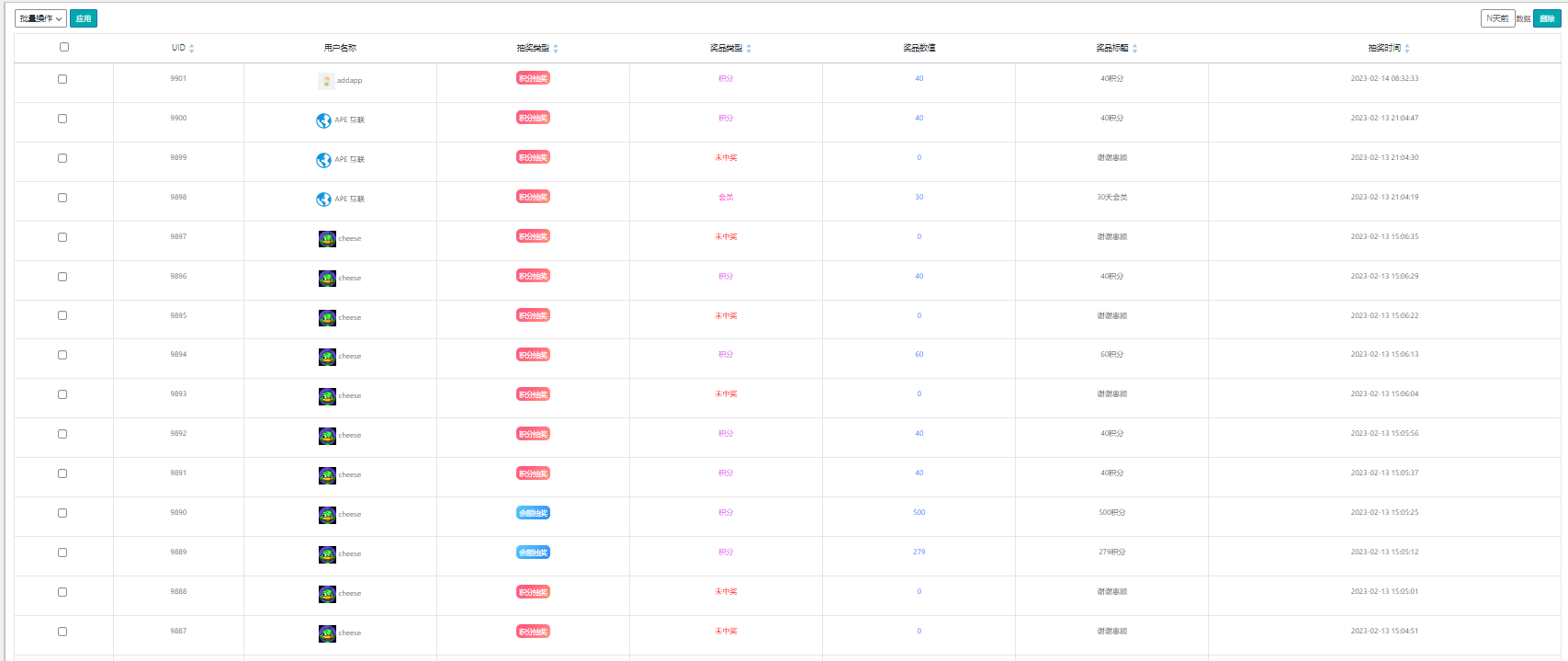 每个用户抽奖的记录都会记录在此,前台也有个抽奖记录,只显部分抽奖记录供用户查看!