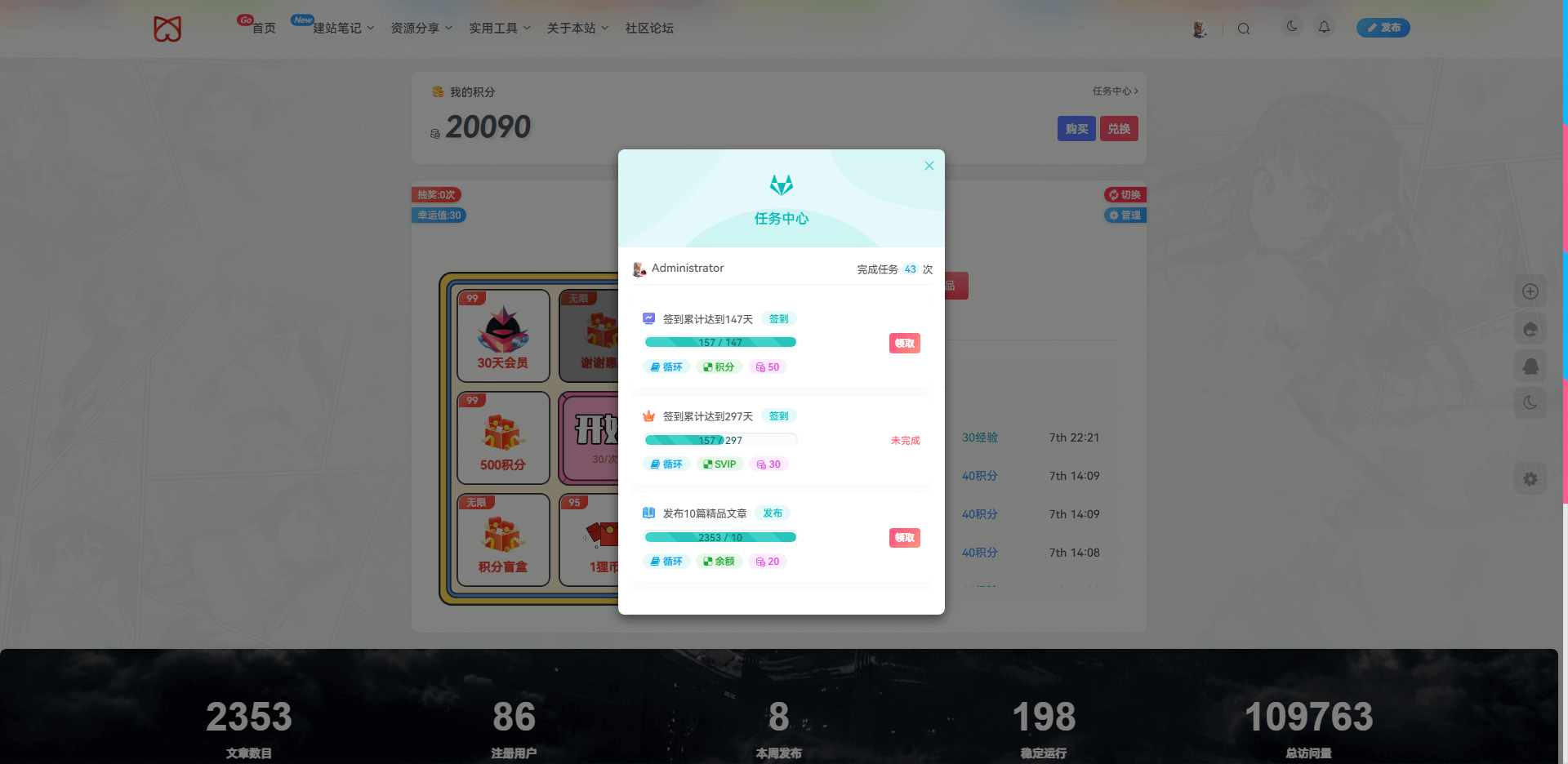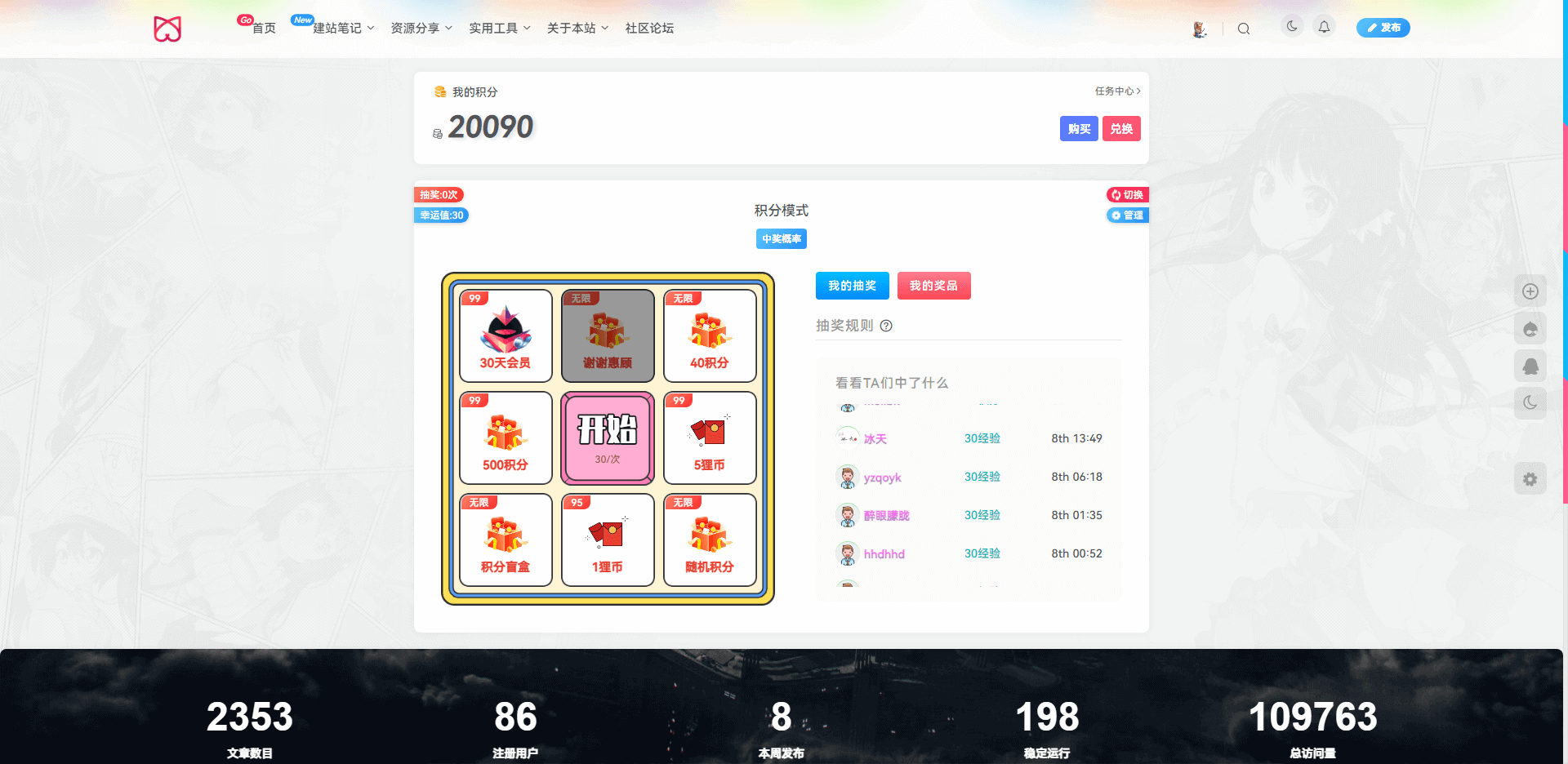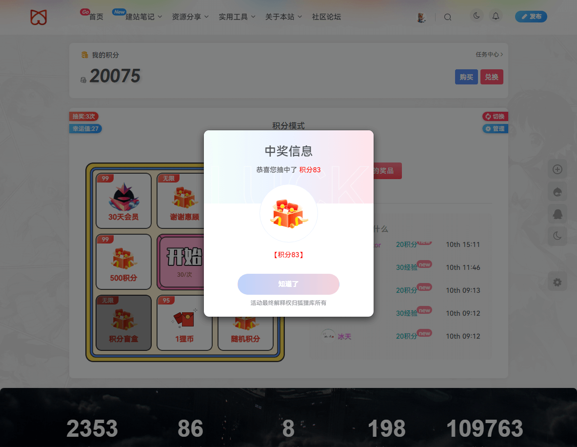 贴心的积分显示,漂亮的抽奖界面,还带规则说明跟抽奖记录!(手机端还是采用老版抽奖界面,PC端使用的是新版界面)
